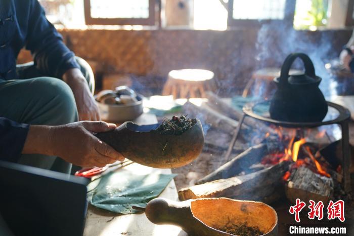9月16日,云南普洱景迈山布朗族人在火塘边制作烤茶。 中新社记者刘冉阳摄