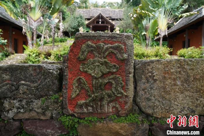 9月16日,云南普洱景迈山布朗族村寨中的一块茶叶浮雕。 中新社记者刘冉阳摄