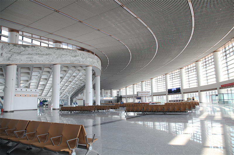 走进候车大厅,映入眼帘的便是宽敞明亮的进站大厅,简洁大气的吊顶设计、素白的内饰搭配上黄色的候车座椅,正是时下流行的奶油风。据悉,素白提取自儒林镇湖头村的徽派民居建筑,黄色提取自茅山华阳洞内的金坛百丈,象征着开放包容,大厅吊顶借鉴金坛刻纸文化,形成了渐变的天窗形式,营造出温暖的感觉。特别在候车大厅正立面,是一面长136米、高4.1米的铝板艺术雕刻形式,展现了金坛刻纸国家级传承人杨兆群策划的百米长卷《大运河》图景,极具金坛的人文气息。