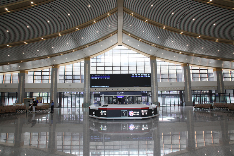候车大厅共设置了1008个候车座椅,部分座椅也安装了显示屏和USB接口,可供旅客候车时休闲娱乐和手机充电。正对进站口的是服务中心,不仅提供售票服务,还设置了公安制证窗口,可以办理临时乘车身份证明。进站口的右侧是售票综合服务中心,可以办理售票、退票、改签等业务,还有8台自助售票机提供自助服务。