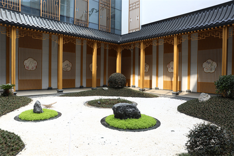 武进站从设计之初,就将“山水连绵,园艺新城”的设计理念贯穿其中,将江南园林景观融入高铁站房空间意象设计,打造“屋下有园,园外有廊”的意境。武进站还是沪宁沿江高铁8个车站中唯一有露天中庭的车站,走进中庭,漏窗剪影,白墙上装点着古诗文和水墨花鸟图,满满江南韵味。
