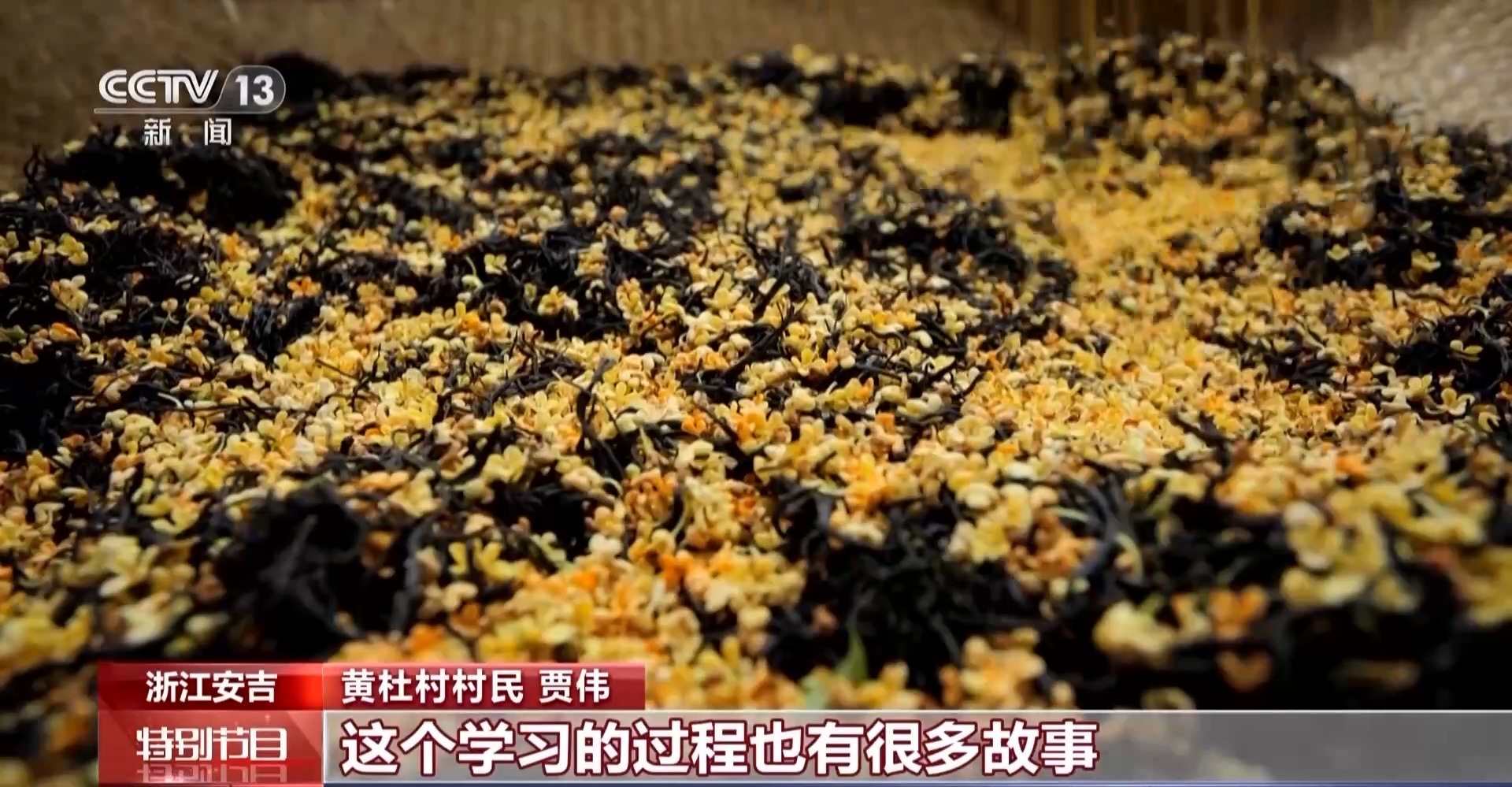 黄杜村村民贾伟:窨花是把茶叶和鲜花混合在一起,鲜花的香味就会被茶叶吸附。上武夷,飞云南,到安徽、广西,到处去拜师学艺。这个学习的过程也有很多故事,现在回想也都是“事故”了。一开始是经常做坏,一锅都很多钱,但是也是想要拓展我们安吉白茶的产品线路,觉得自己一定要把这个事情做起来,然后就一直坚持下来。现在的话整个效果还是蛮好的,我们现在基本上有十几个品种,每年的销量也比我父辈那时候要增长了有几十倍。