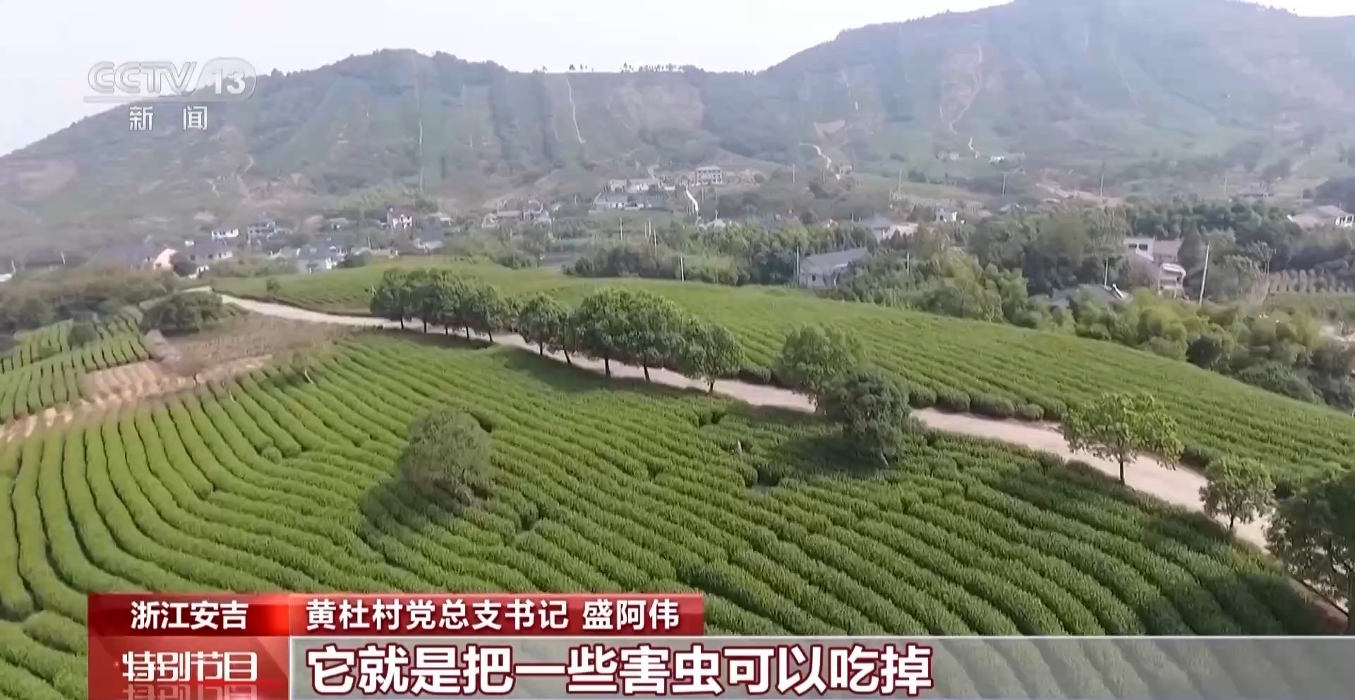 黄杜村党支部书记盛阿伟:我们这个茶树是一个灌木,不是很高的。如果全部大面积种植茶树以后,鸟类在上面就停不下来,很多鸟是会吃害虫的。套种了很多树木以后,鸟就能在这里安家了,把一些害虫可以吃掉。