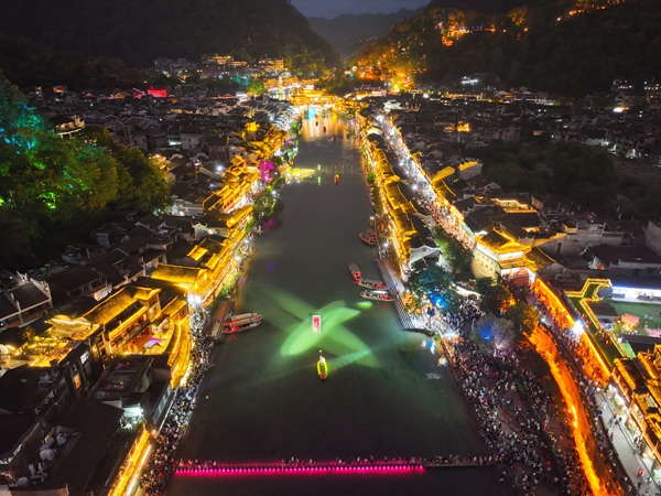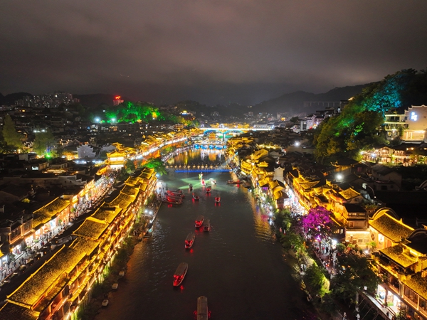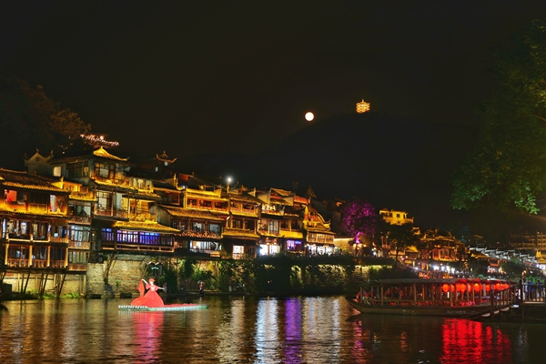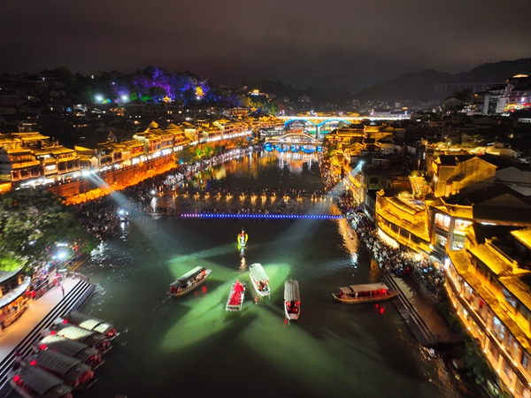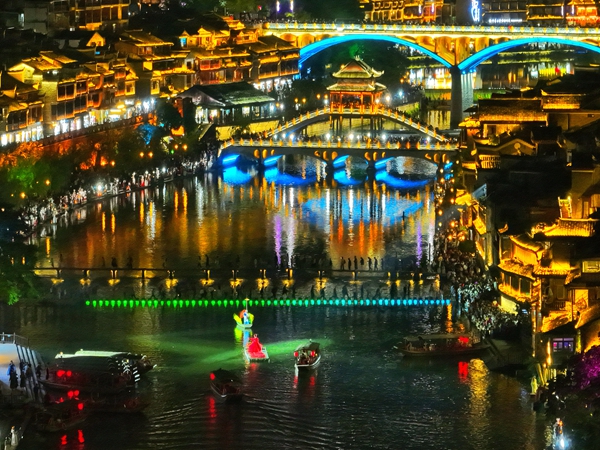 沱江两岸璀璨的灯光交相辉映,流光溢彩、美不胜收。一袭红装的翠翠在江心处随着音乐舞动,舞姿婀娜,笑容嫣然,不时和两岸的游人挥手问好。众多游客泛舟顺流而下,欣赏夜色中迤逦的吊脚楼群,一睹通体透亮的万名塔和轮廓毕现的虹桥风雨楼,两岸的酒吧现代元素和古老风韵建筑相互交融,醉了这一片山水,惊艳了远道而来的游人。