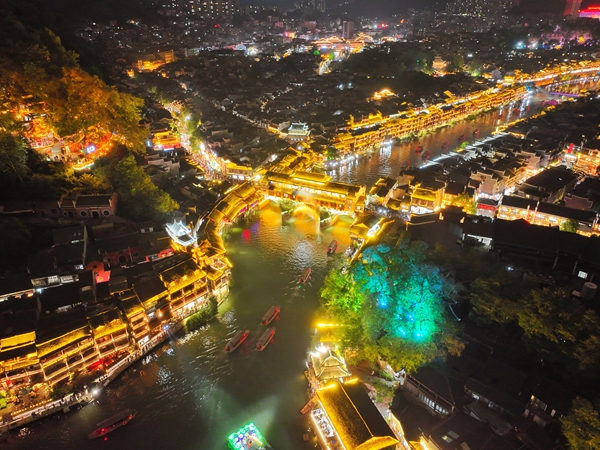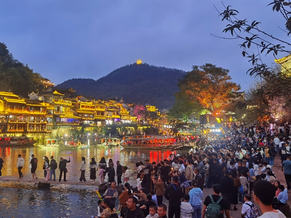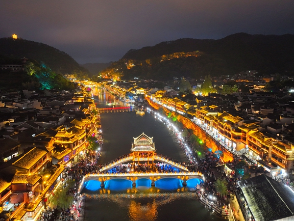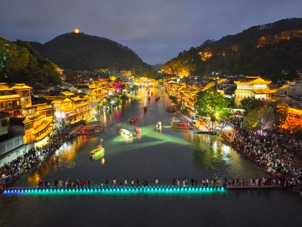 爬上南华山俯瞰,古城万般景色尽收眼底。目之所及,灯火辉煌,游人如潮,影影绰绰,人声鼎沸。游人们漫步在青石路上,或在古城墙边,或在雪桥之上,欣赏这美丽怡人的古城夜色,感受古城厚重的历史文化、唯美的山水风光。不少穿着苗装的游客们摆着各种姿势,把愉悦的心情,定格在溢满节日气息的古城之中。沱江边不少穿着民族特色服装的苗家阿妹拿着手机化身“网红”,向全国各地看客直播凤凰迷人夜色,介绍国庆古城旅游热闹景象,讲述凤凰悠久的人文历史故事。夜色中的一景一物,都在灯光的衬托下留给游客美好的回忆,让游客在光影的斑斓世界中感受古城静谧之美。