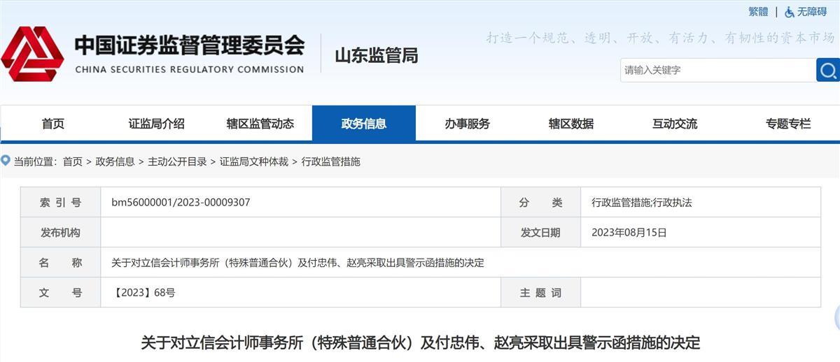山东证监局决定对立信会计师事务所采取出具警示函的监督管理措施并记入证券期货市场诚信档案数据库。