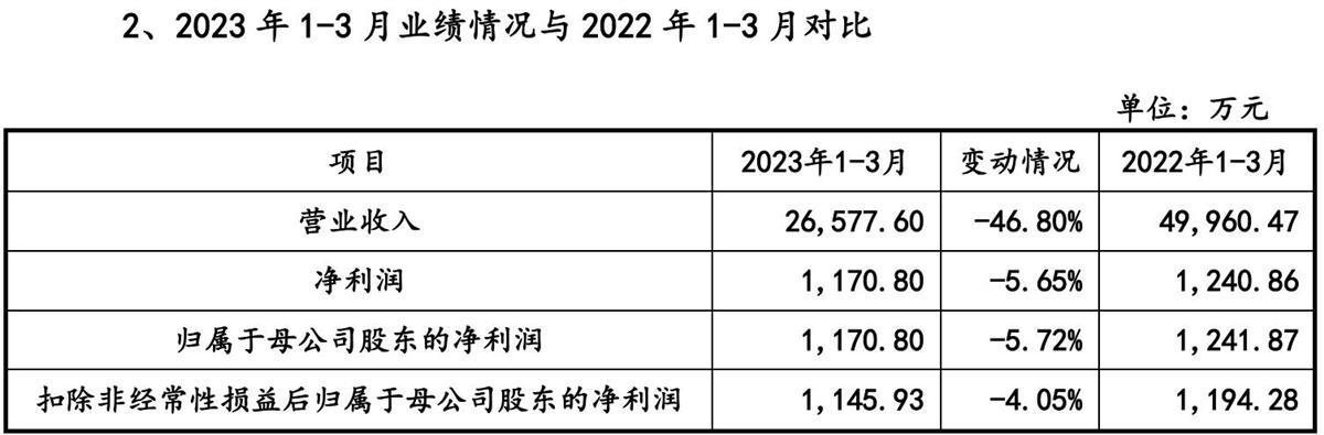 除了报告期,惠柏新材2023年第一季度的业绩也受到影响。今年一季度,惠柏新材实现营业收入26,577.60万元,较2022年同期的49,960.47万元下降23,382.88万元,降幅46.80%,主要由于风电叶片用环氧树脂收入同比下降22,556.06万元所致。