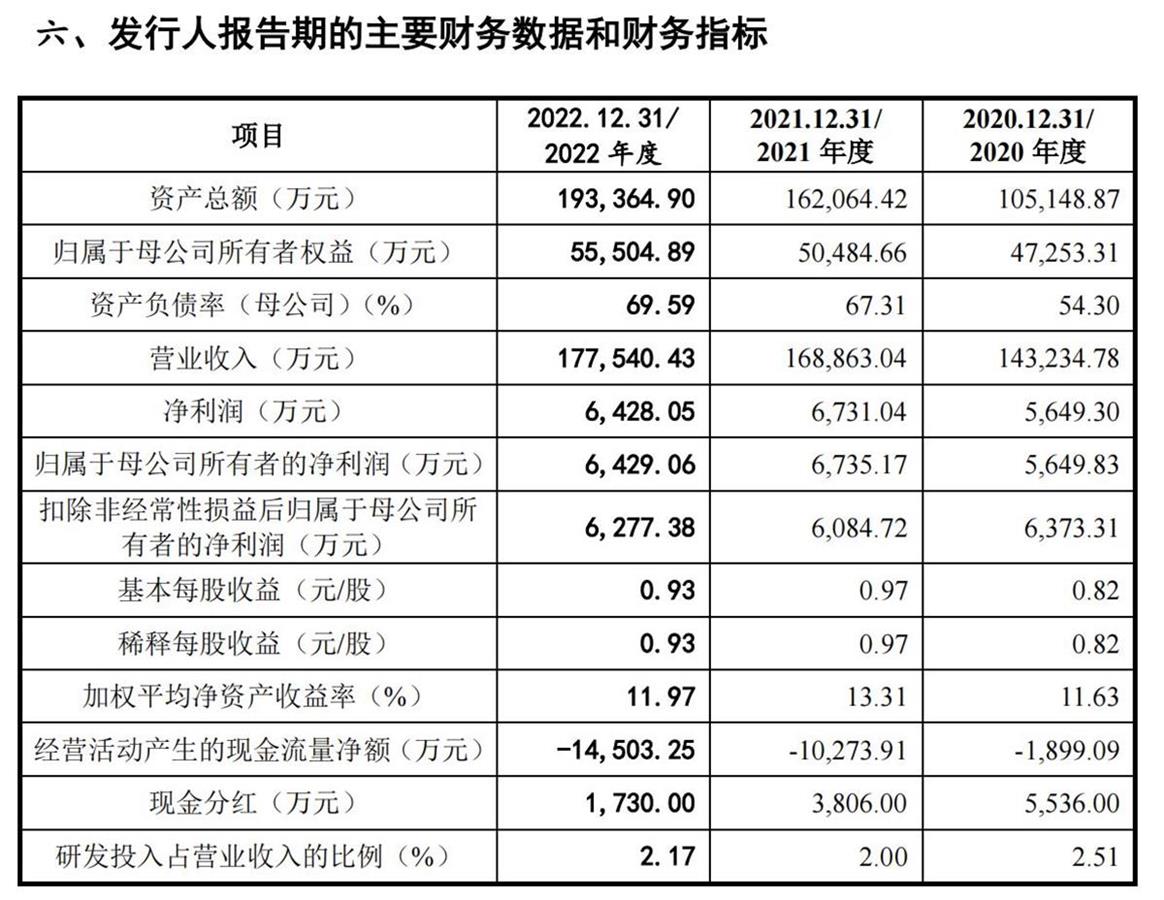 从营业收看,惠柏新材报告期的营业收入分别为143,234.78万元、168,863.04万元、177,540.43万元。可以看出,惠柏新材2022年的营业收入增幅已经低于10%。惠柏新材报告期的的净利润分别为5,649.30万元、6,731.04万元和6,428.05万元。