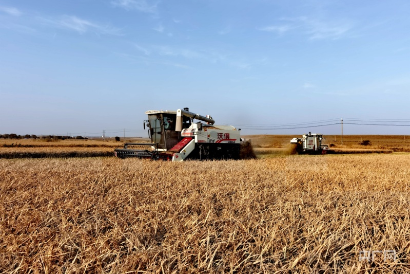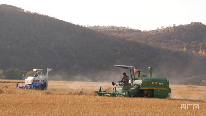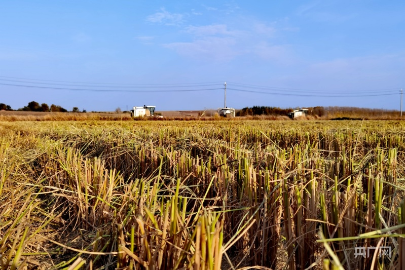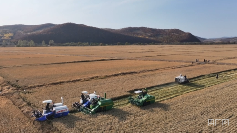 位于阿荣旗的有机稻田正在进行收割作业(央广网发李刚摄)