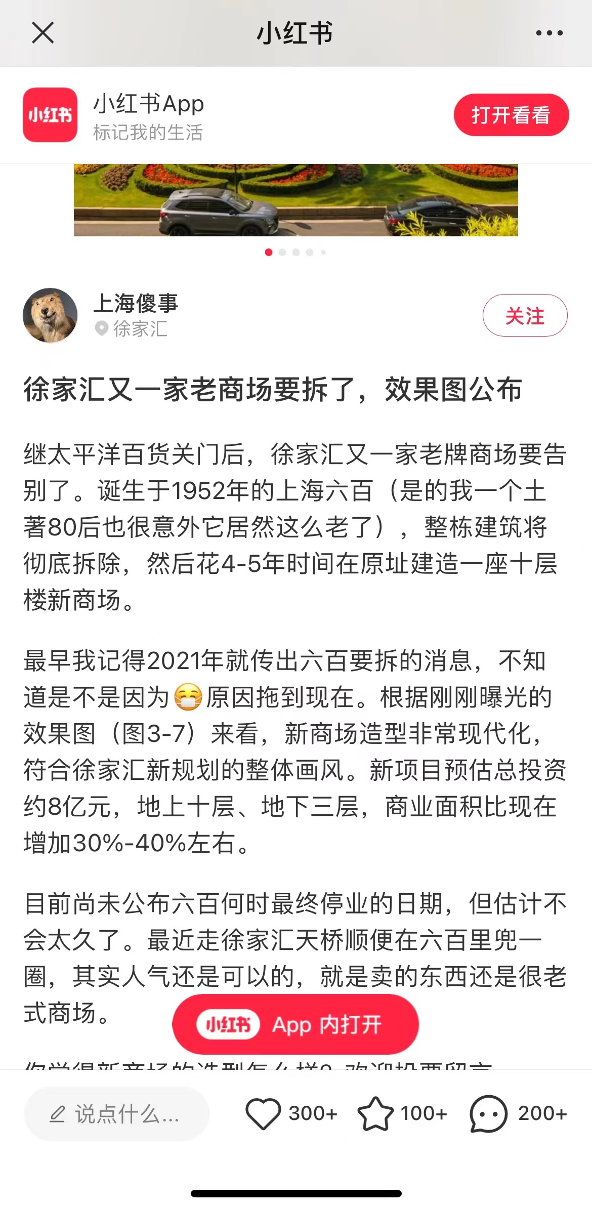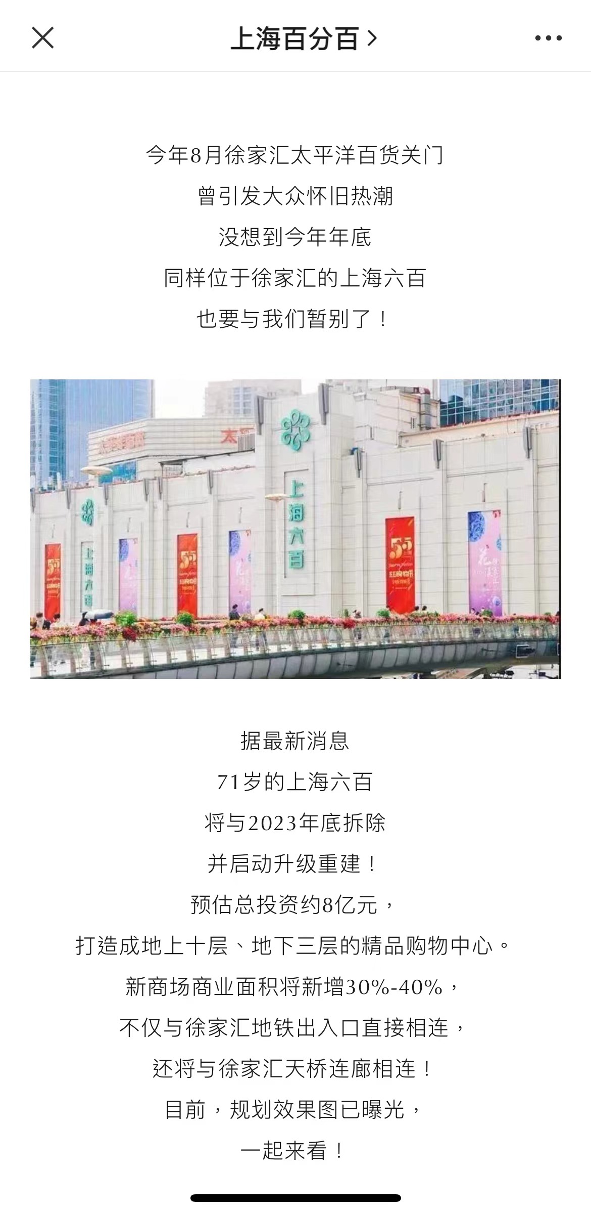 近日,有自媒体及生活方式平台发布消息称,拥有71年历史的上海六百百货即将于2023年底拆除重建。