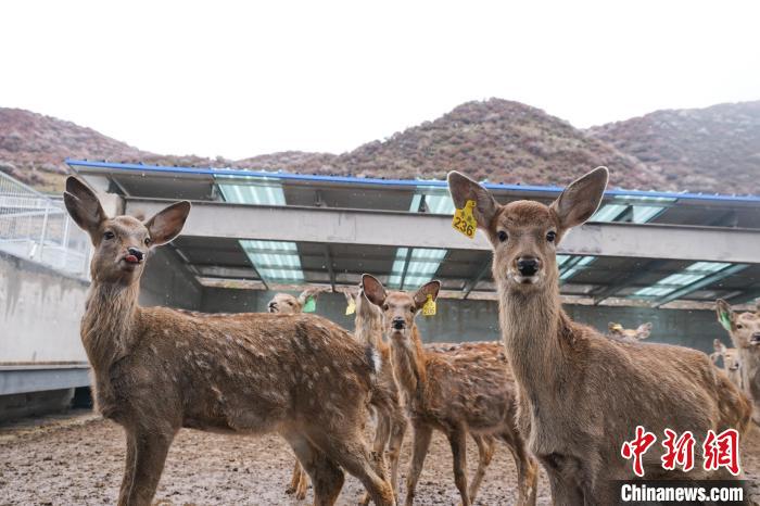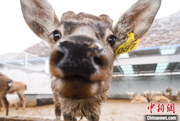 图为在青海省西宁市湟中区群加藏族乡上圈村的梅花鹿养殖基地内,梅花鹿卖萌。马铭言摄