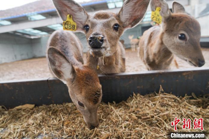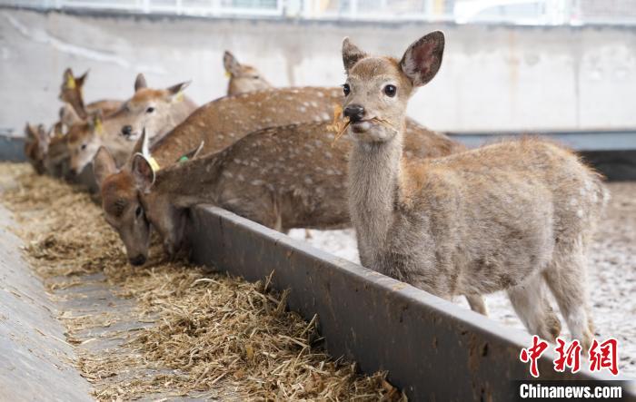 图为在青海省西宁市湟中区群加藏族乡上圈村的梅花鹿养殖基地内,梅花鹿进食,呆萌可爱。马铭言摄