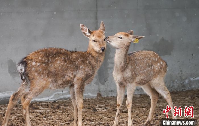 图为在青海省西宁市湟中区群加藏族乡上圈村的梅花鹿养殖基地内,梅花鹿互相舔舐毛发。马铭言摄