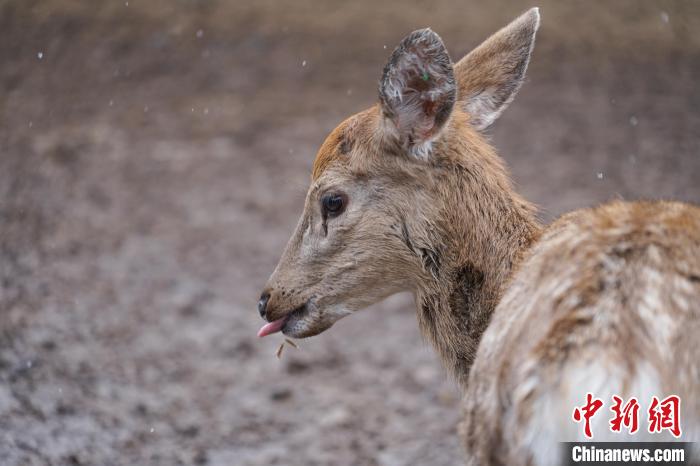 图为在青海省西宁市湟中区群加藏族乡上圈村的梅花鹿养殖基地内,梅花鹿吐舌卖萌。马铭言摄