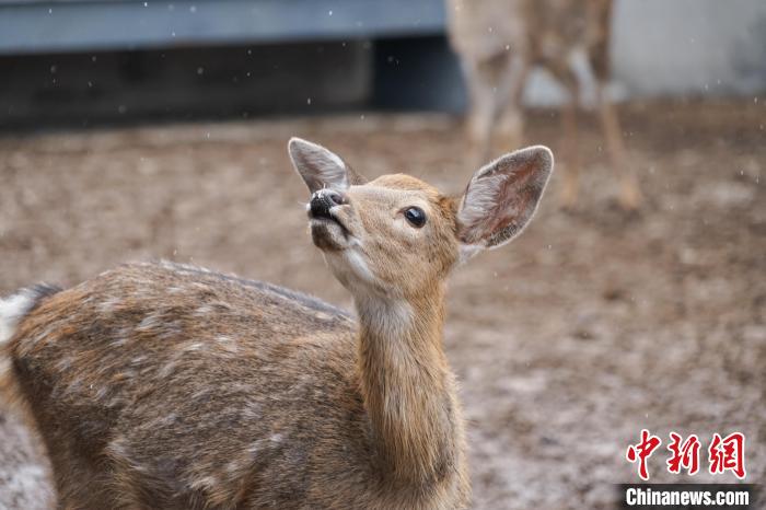 图为在青海省西宁市湟中区群加藏族乡上圈村的梅花鹿养殖基地内,梅花鹿抬头“赏”雪。马铭言摄