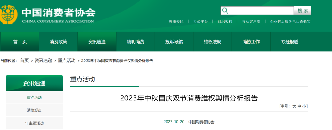 据中消协官网,中消协10月20日发布《2023年中秋国庆双节消费维权舆情分析报告》(简称《报告》)。中消协利用舆情监测系统,对9月28日至10月7日期间相关消费维权情况进行网络舆情大数据分析,共计10天监测期内,收集到“消费维权”相关信息1002207条,日均约10万条。《报告》提及,“酒店楼梯房卖650元”“民宿被涨价四倍”等假日经济乱象引发热烈讨论。