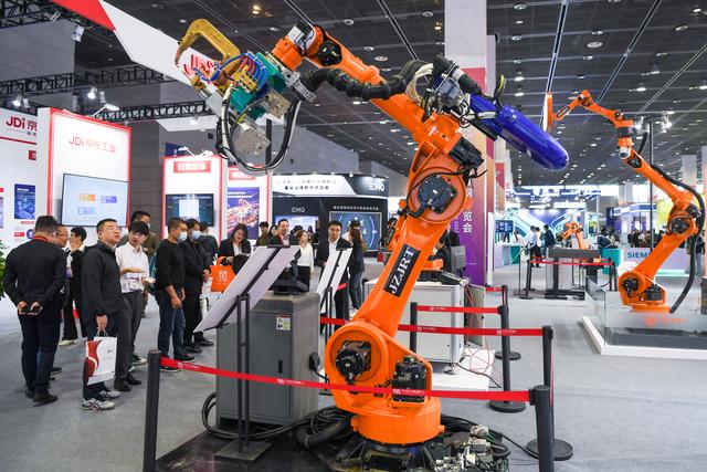 10月21日在2023世界物联网博览会活动现场拍摄的智能机器人工作站。新华社记者 李博 摄