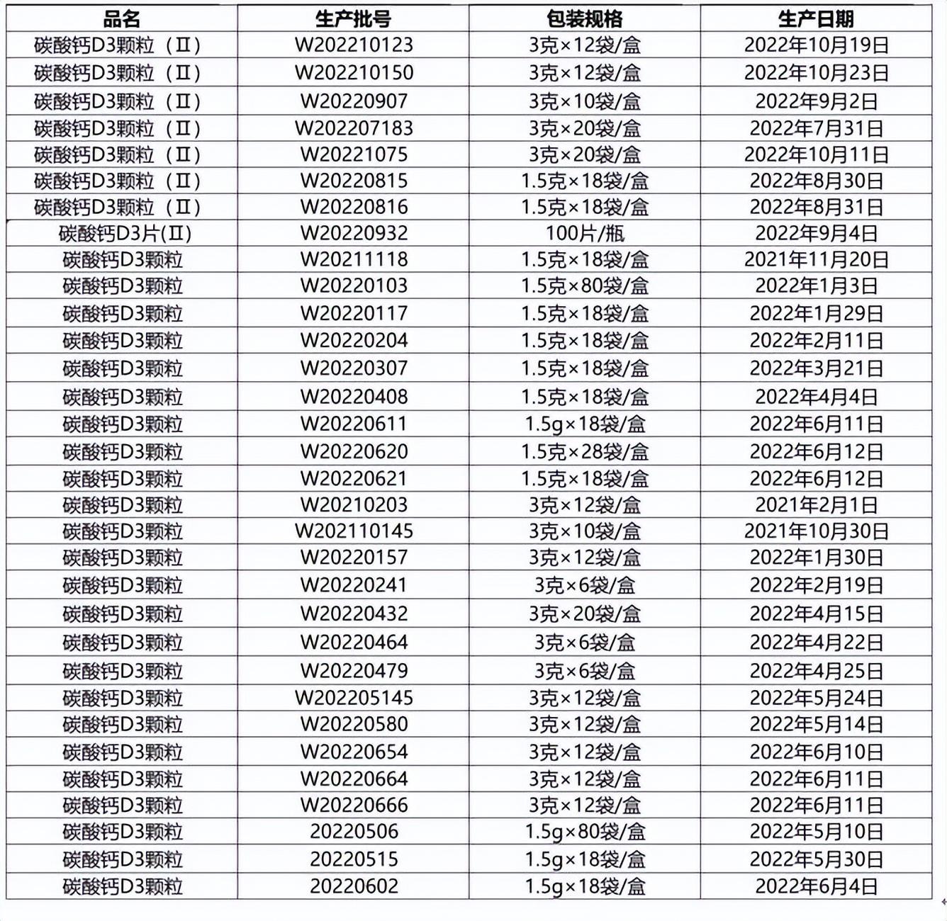 具体来说,这32批次的产品包括24批次的碳酸钙D3颗粒、7批次的碳酸钙D3颗粒(Ⅱ),以及1批次的碳酸钙D3片(Ⅱ)。