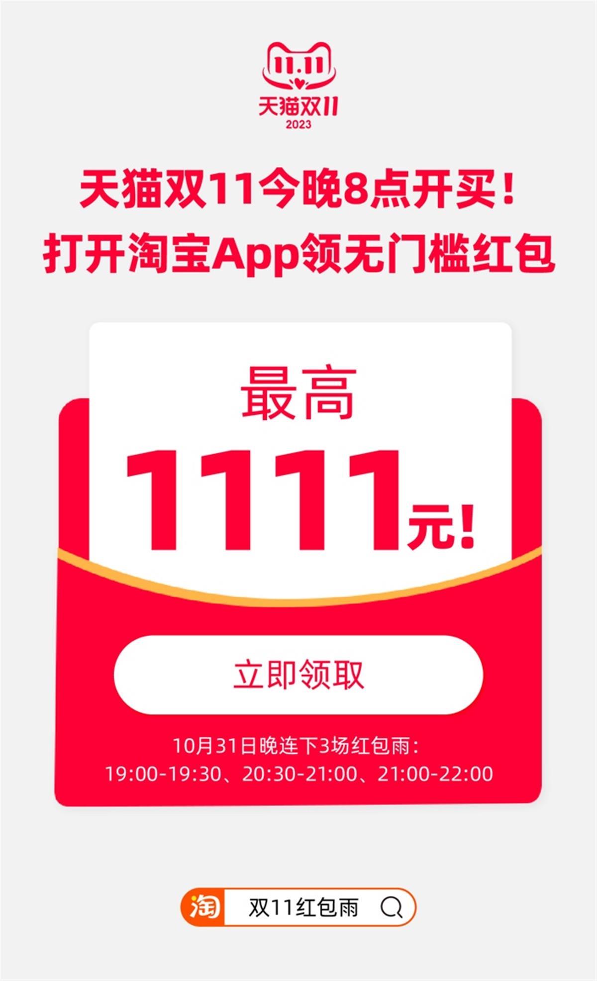 极目新闻记者从天猫获悉,在“满300减50”、官方立减直降、88VIP大额券等优惠基础上,还将新增3场红包雨,只需打开手淘App或搜索“双11红包雨”,就有机会获得最高1111元的无门槛红包,成为双11锦鲤。
