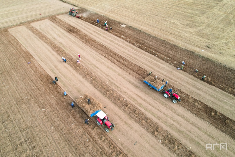 央广网兰州11月4日消息(见习记者逯文婕 通讯员王晓泾)深秋,正值黄芪的采收季节。在甘肃省张掖市民乐县南丰镇黑山村黄芪种植基地里,伴随着轰鸣的机械声,一根根粗壮的黄芪破土而出,工人们忙着采摘、分拣、装车……田间地头一派丰收的繁忙景象。