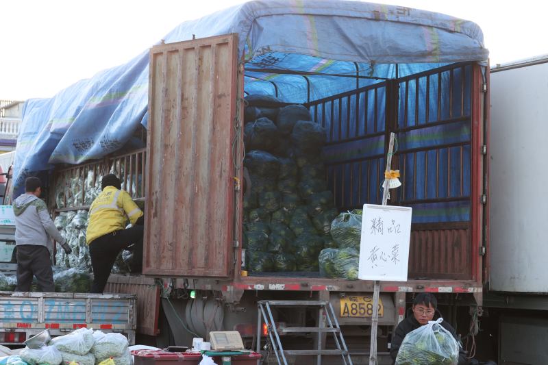 新发地市场内,商户正在批发黄心菜。新京报记者 陈琳 摄