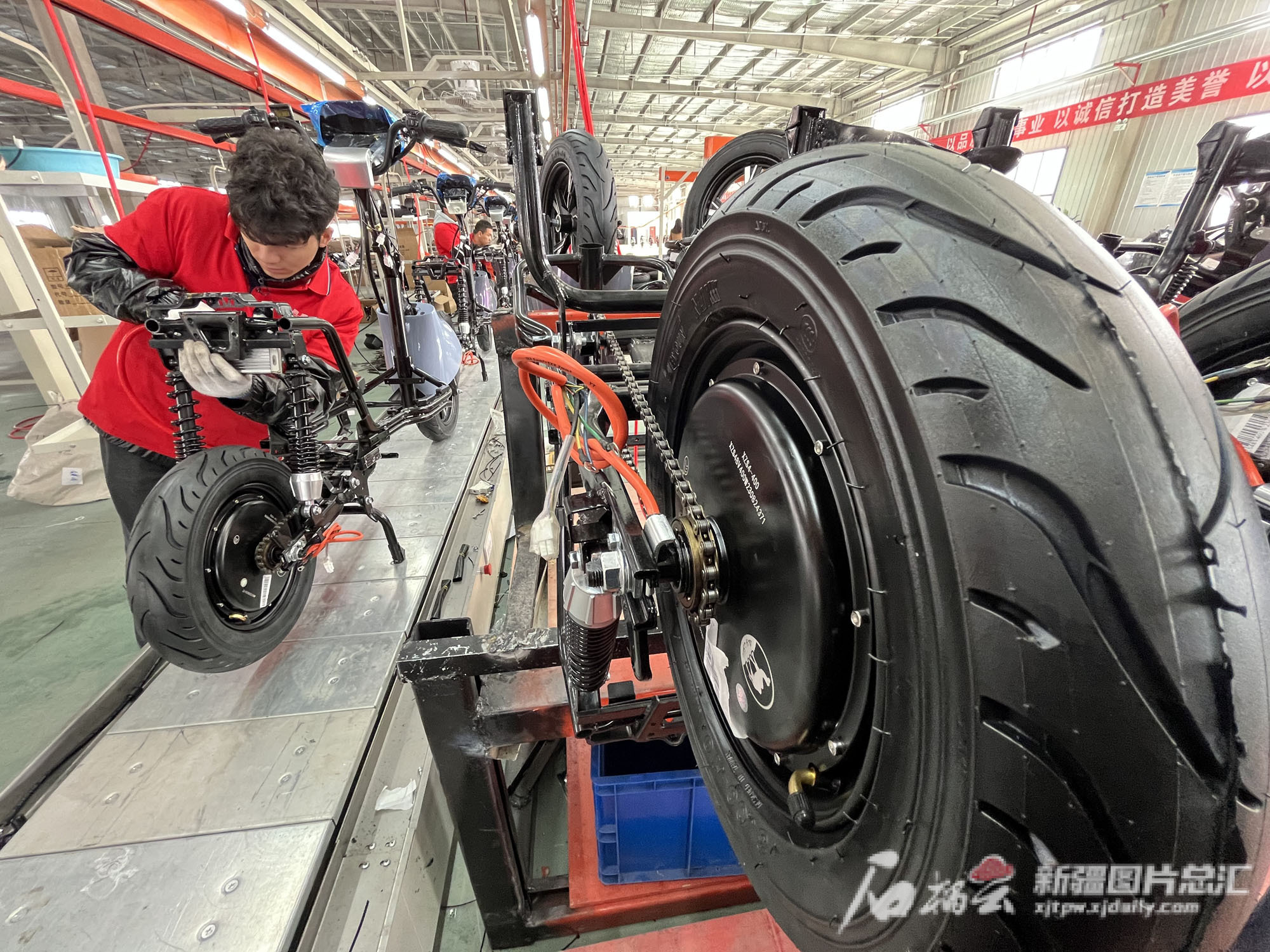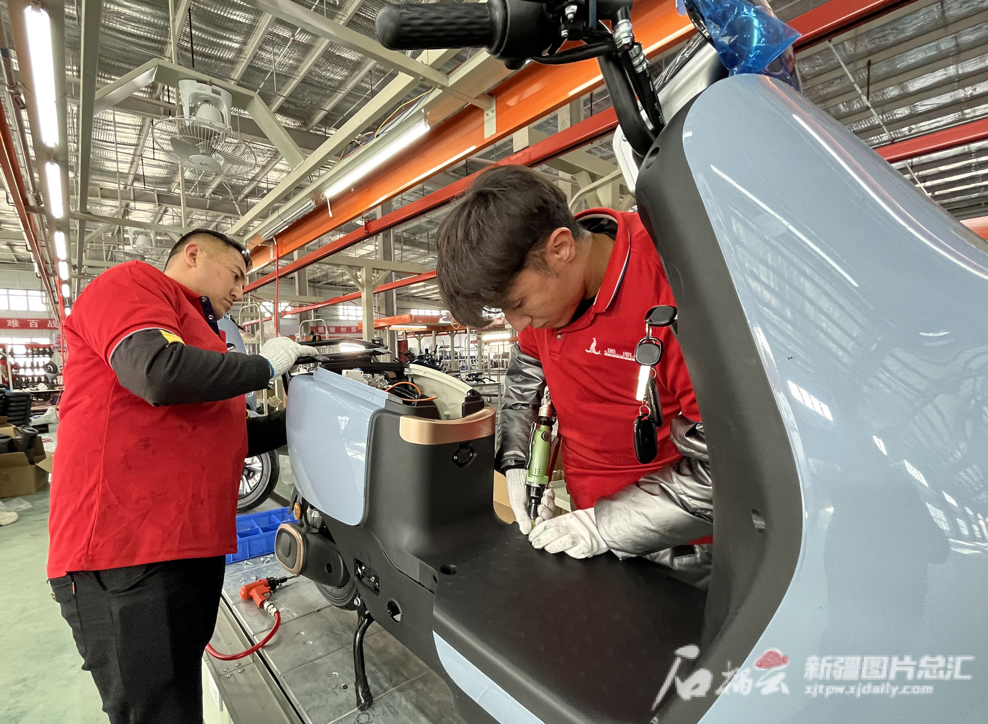 11月10日,工人在位于克州江苏产业园的飞凤车业(克州)有限公司生产车间组装电动摩托车。