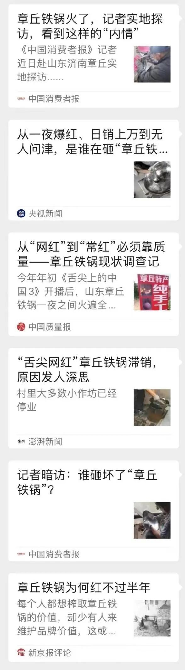 在《舌尖上的中国》播出后,章丘铁锅曾一度引发抢购热潮,求锅者从线上店铺追到线下工厂,求锅者高昂的热情让当地铁锅生产小作坊迅速增长至170家,只要有打铁工具的人家,几乎都投身其中。有了《舌尖上的中国》节目的背书,章丘铁锅却一度没有保住自己的“金字招牌”。很快,这股热潮就走向了消解:假货横行、以次充好、偷工减料……鱼龙混杂之下,市场上对章丘铁锅的否定声越来越多。2018年前后,也有大量媒体对章丘铁锅“遇冷”一事进行了报道。