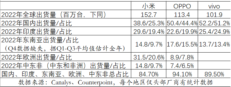 市场研究机构IDC数据显示,2015年全球出货量前五大智能手机厂商中,华为、联想、小米在列,出货量共2.51亿台,三家共占比17.5%,2022年则是小米、OPPO、vivo在列,三家出货量共3.55亿台,占比29.5%。从2015年到2022年,头部国内品牌在全球市场不管是出货量还是市场份额都有所提升。