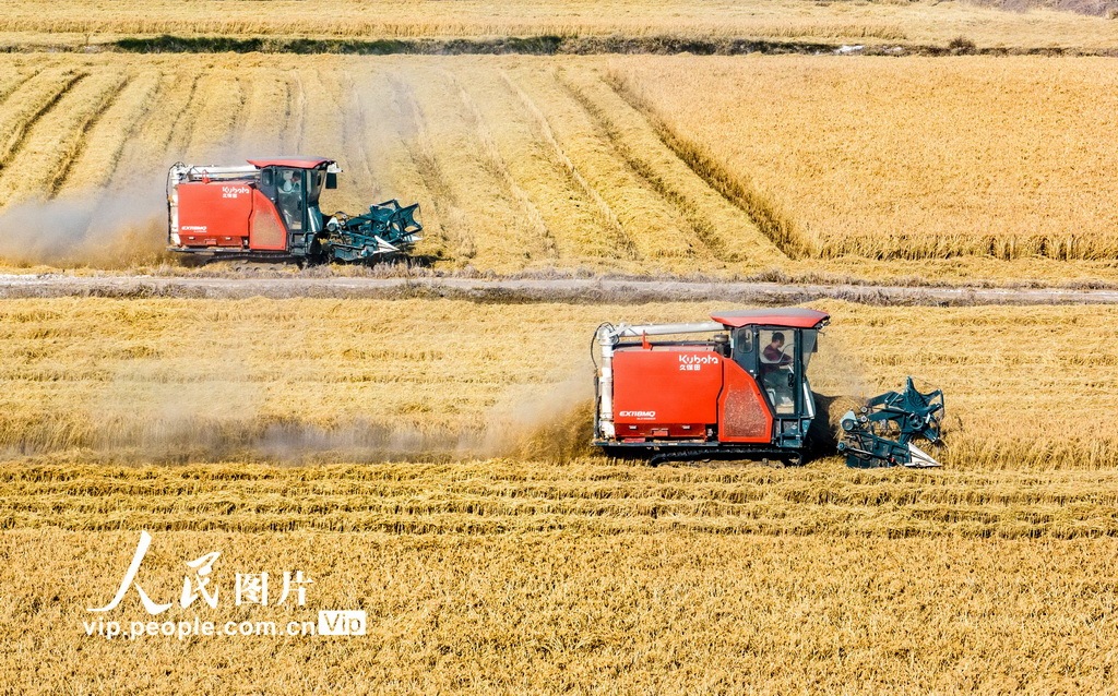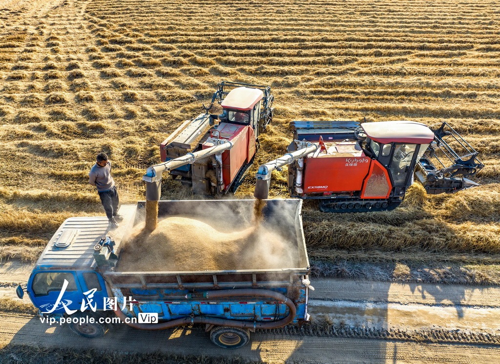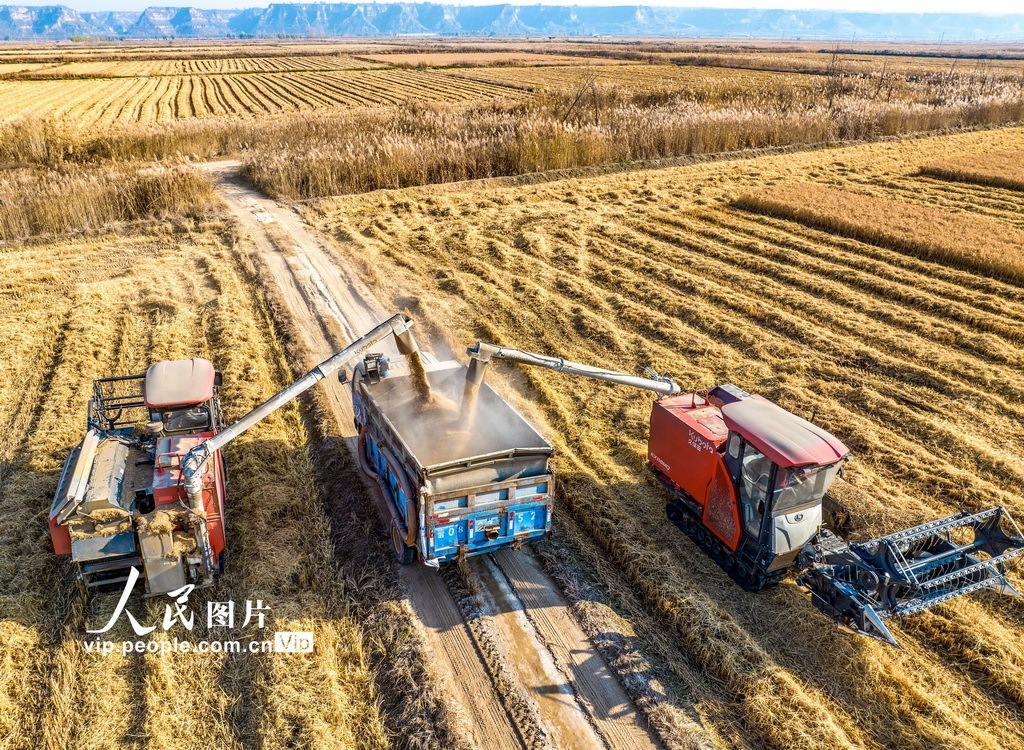 初冬时节,山西省运城市万荣县黄河滩涂近2万亩水稻喜获丰收,农民正抓住晴好天气,利用大型收割机加紧收割水稻,确保颗粒归仓。