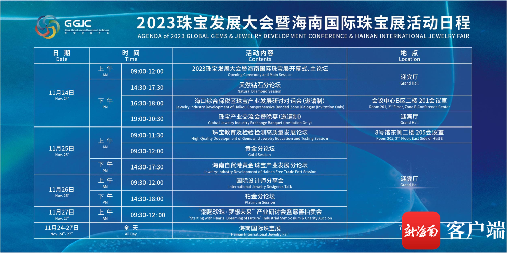 新海南客户端、南海网11月20日消息(记者王子遥)记者从2023珠宝发展大会暨海南国际珠宝展新闻发布会上获悉,2023珠宝发展大会暨海南国际珠宝展将于11月24日至27日在海南国际会展中心举办。