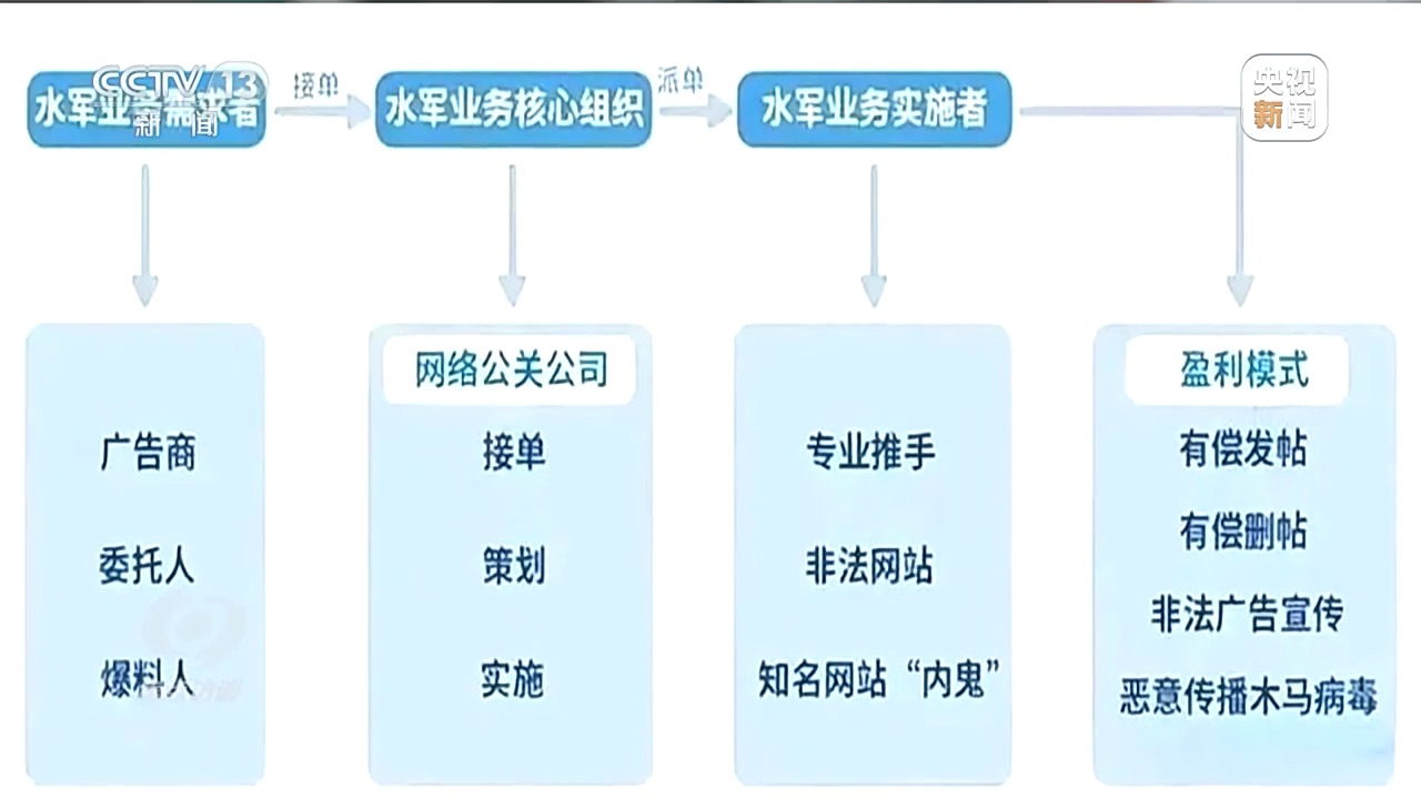 梳理相关案件可以发现,“网络水军”的运作已经形成了模式化流程和产业链。广告商、委托人、爆料人等“水军业务需求者”在平台下单后,由所谓的网络公关公司接单并派发给专业“刷手”等“水军业务实施者”。这些“水军”按任务要求操作,牟取非法利益后,相关人员再按比例进行分成。