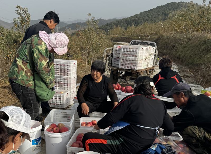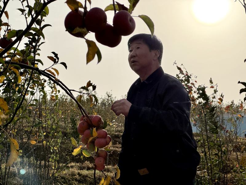今年的秋天是个暖秋,果园里的收获季也比往年晚一些。11月的深秋,采摘的农人已经穿上棉衣,把红彤彤的苹果,从树尖尖上摘下来,放进篮子,搬到旁边的空地,再整齐地码放进框子里。储藏在冷库的苹果,能放到明年五月份,依旧保持爽脆。