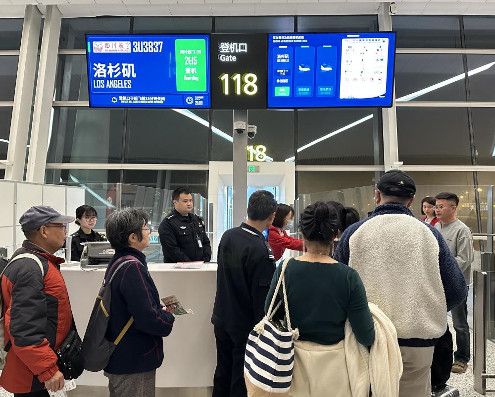 旅客们从成都天府国际机场登机,飞往美国洛杉矶。(赵汪洋 摄)