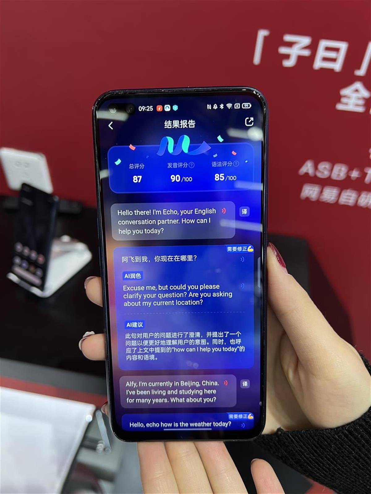 极目新闻记者也上前与“网红”Echo进行了对话。电影、考试、职场、美食、兴趣、旅行……各类话题Echo都能轻松拿捏。记者尝试用英文交流后,Echo还对记者的口语发音、语法等水平进行了打分,并帮助润色语言风格、对语法错误、发音错误提出了优化建议。