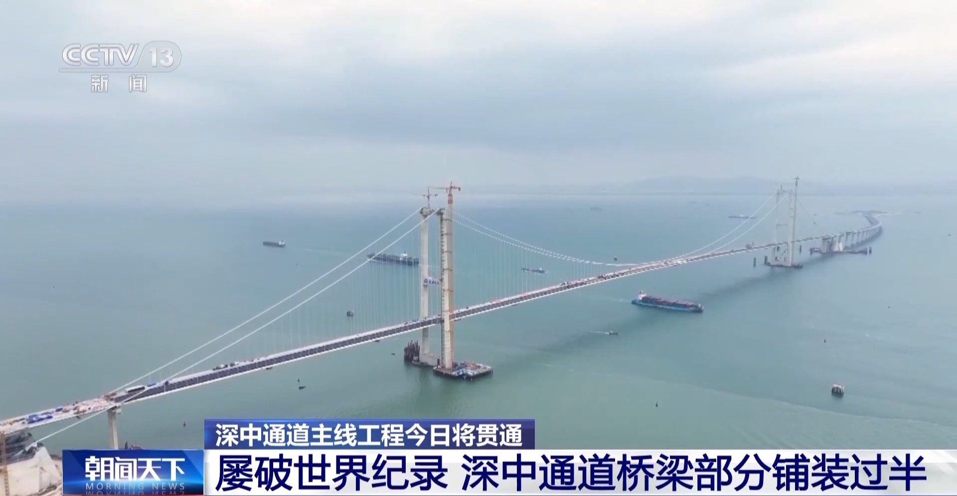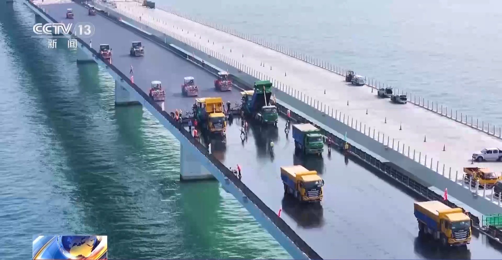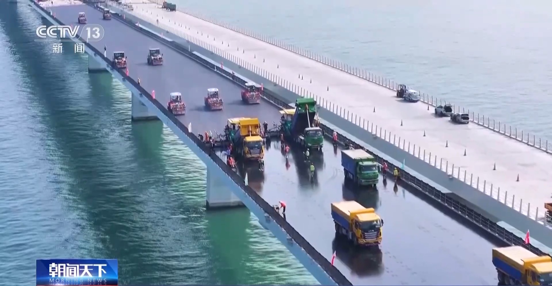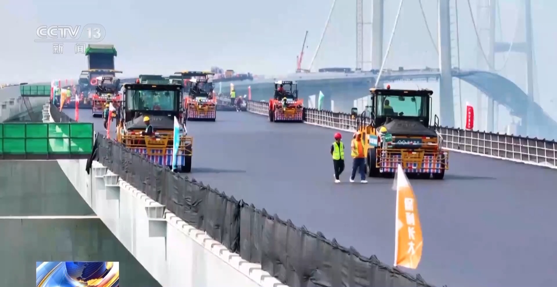总台央视记者 曹丹:在深中通道伶仃洋大桥的桥面铺装现场,200多名建设者,50多台摊铺机、压实机等各种设备正在紧张忙碌地工作着。黑色的沥青桥面正在徐徐展开。