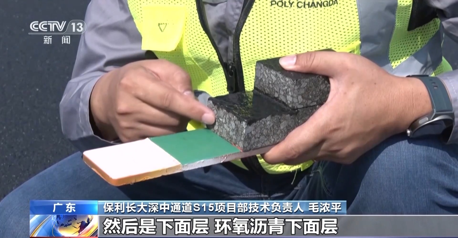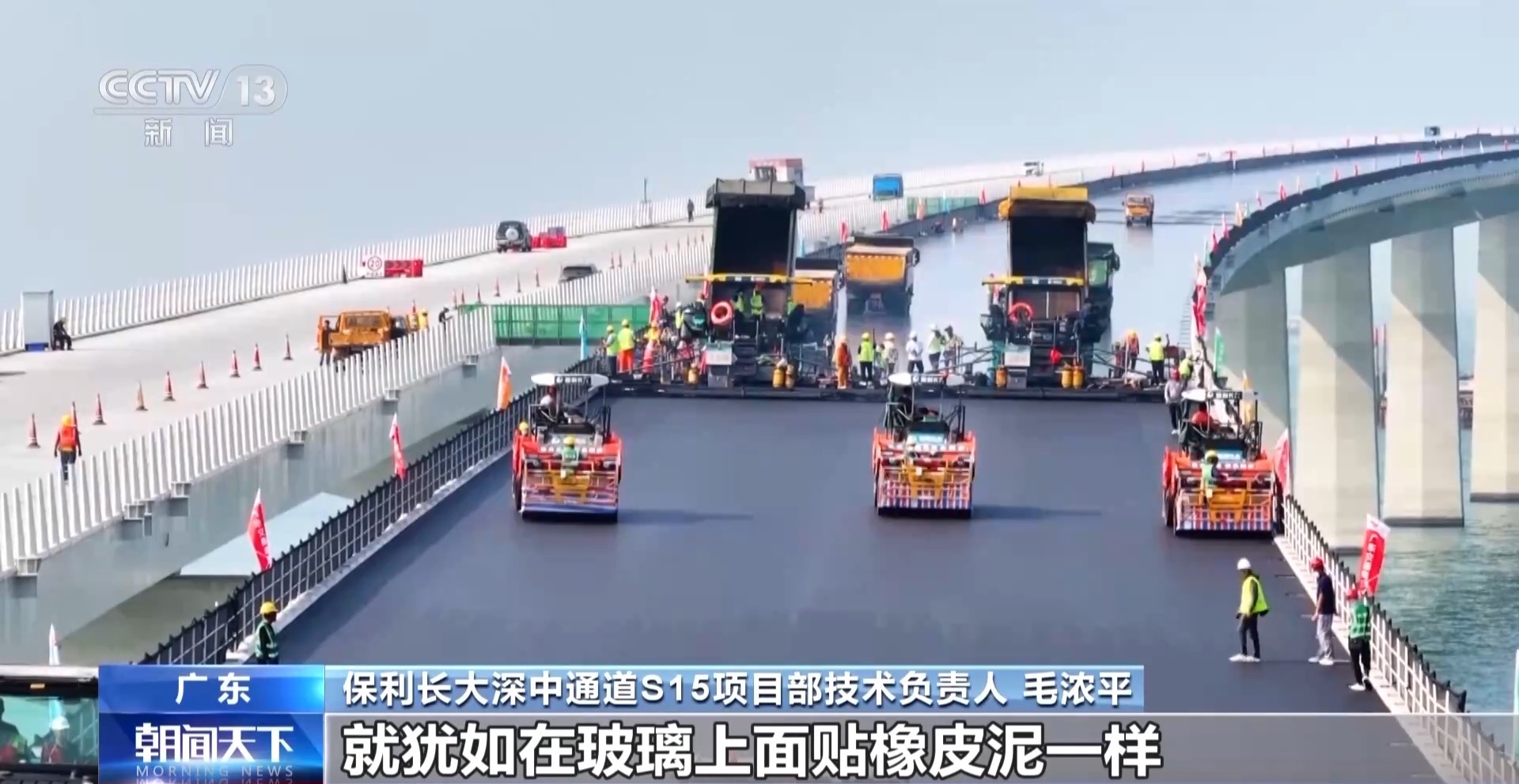 保利长大深中通道S15项目部技术负责人 毛浓平:因为钢板在做完防腐之后,表面是非常光滑的,就犹如在玻璃上面贴橡皮泥一样。所以中间必须要加一层防水黏结层,这一层胶水可以有效地把上下层粘在一起。整个铺装层跟钢板会起到很好的追随性,粘得更牢固。