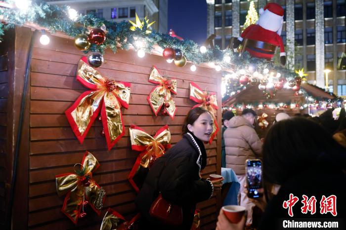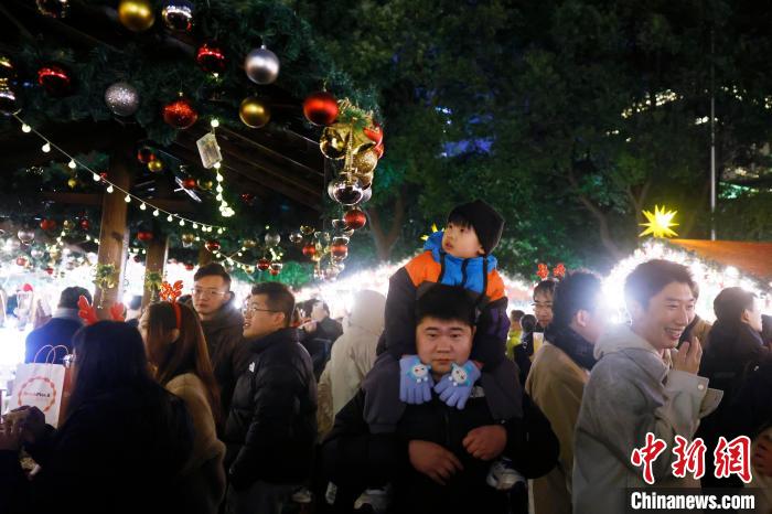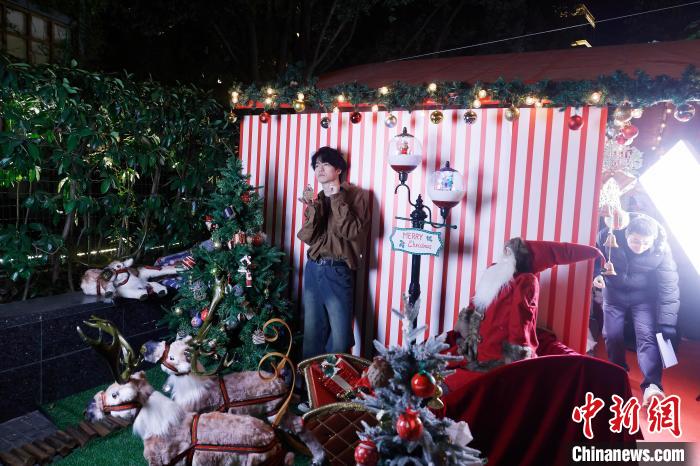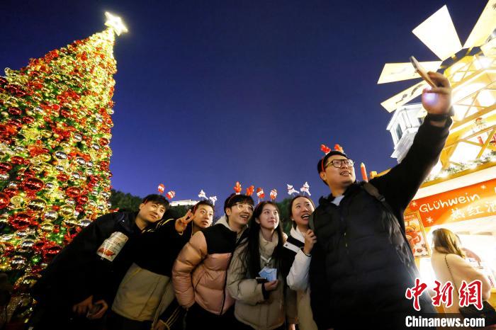 12月2日晚,市民在圆明园路步行街上临时背景墙上合影。 中新网 记者 殷立勤 摄