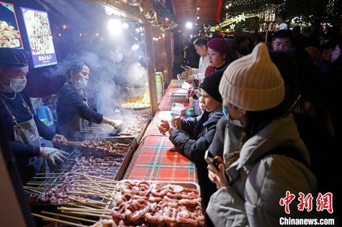 12月2日晚,民众在圆明园路步行街上品尝美食。 中新网 记者 殷立勤 摄