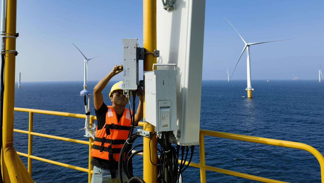 在惠来神泉镇南面海域慈航海风场,神泉一和神泉二风电场海上升压站就矗立在这片蔚蓝之上。广东移动与国家电投揭阳前詹风电有限公司共同推进了风电场66台风机塔筒内部的5G覆盖海上施工,标志着该风场成为广东首个实现5G深覆盖的海上风电场,实现了20-50公里海域5G信号超远覆盖。