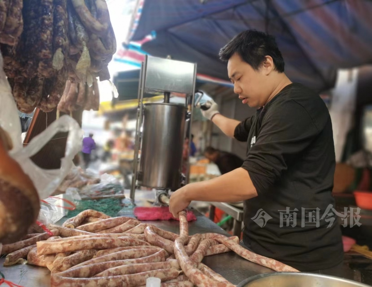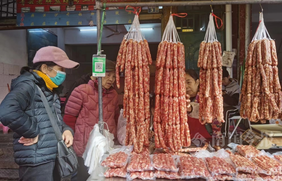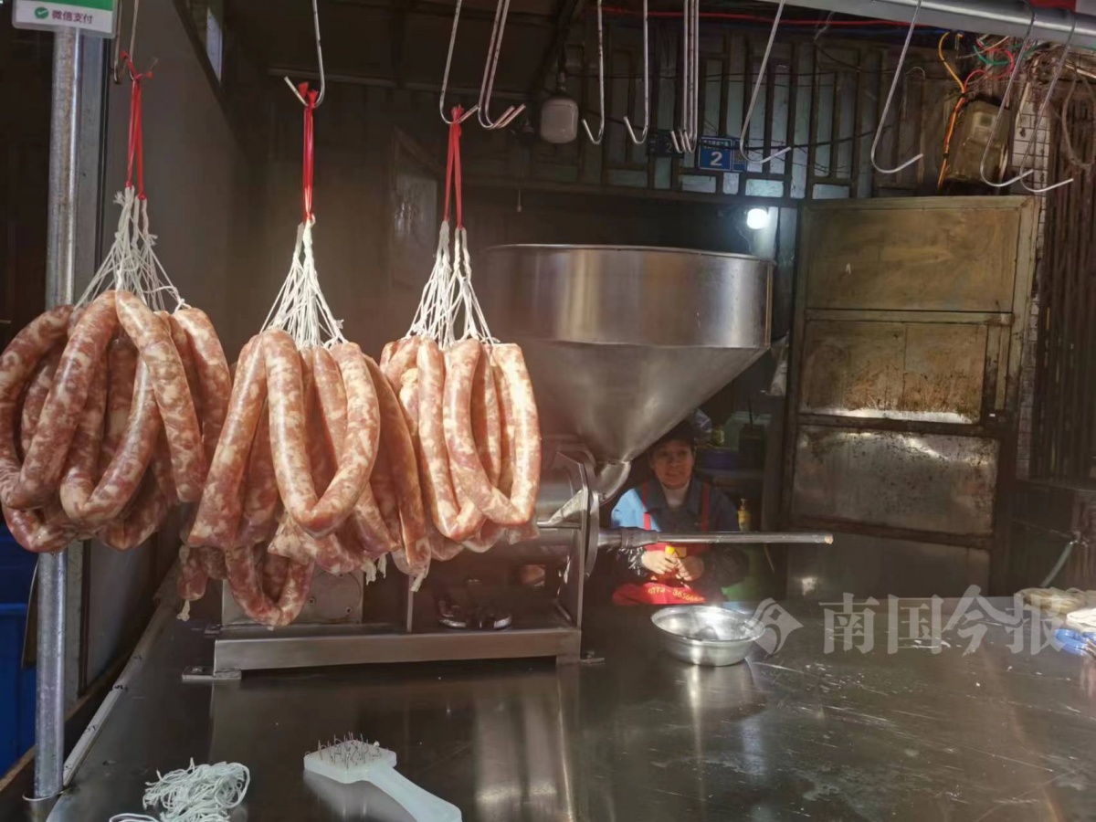 12月7日上午10时许,青云市场人流如织。不少猪肉摊显要位置,都摆放了为顾客腌制好的腊肠和腊肉。