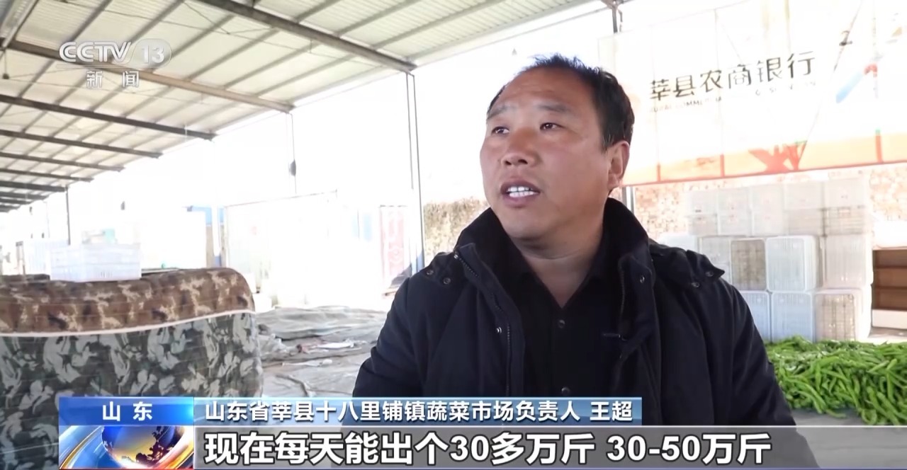 山东省莘县十八里铺镇蔬菜市场负责人 王超:每天能出30多万斤,30至50万斤,现在按这两天量来算,就是十几辆车,山西太原或者西安这几个地方比较畅销。