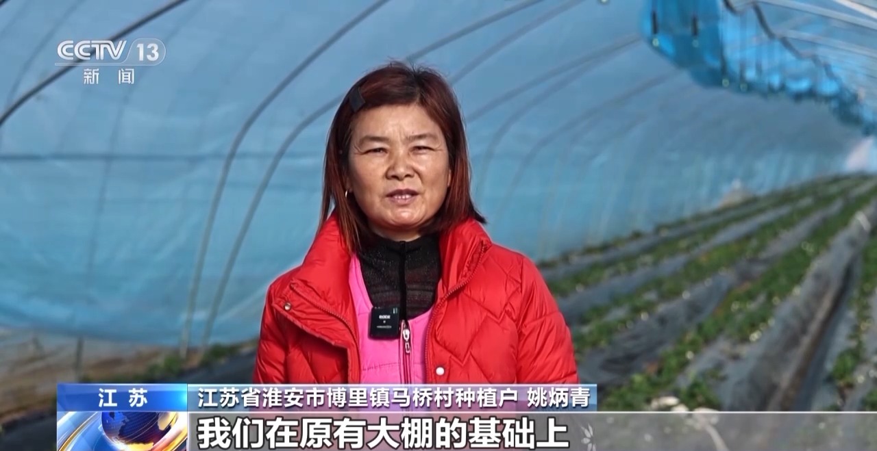 江苏省淮安市淮安区博里镇马桥村种植户 姚炳青:气温下降厉害,我们在原有大棚的基础上,盖上二膜三膜,提高大棚的温度,防止草莓受到冻害,影响生长。