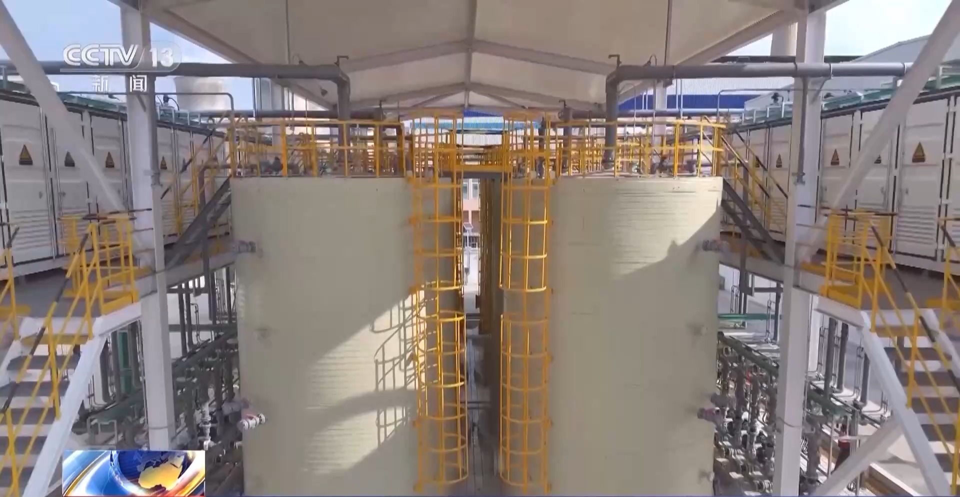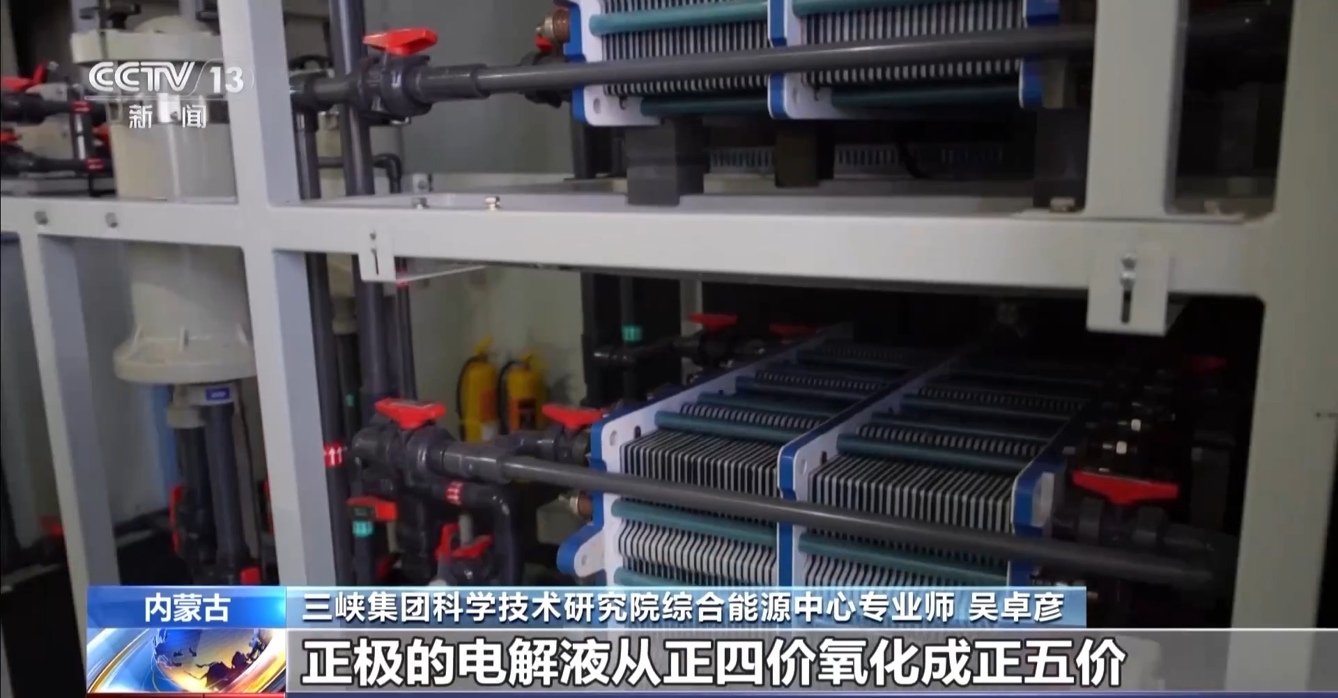 三峡集团科学技术研究院综合能源中心专业师吴卓彦:这套系统就是全钒液流电池储能系统,它的能量主要储存在电解液中。在工作的时候,电解液通过管路还有泵,来到电堆。充电的时候,正极的电解液从正四价氧化成正五价,把电能储存起来,在放电的时候,它从正五价再回到正四价,把电能释放出去。