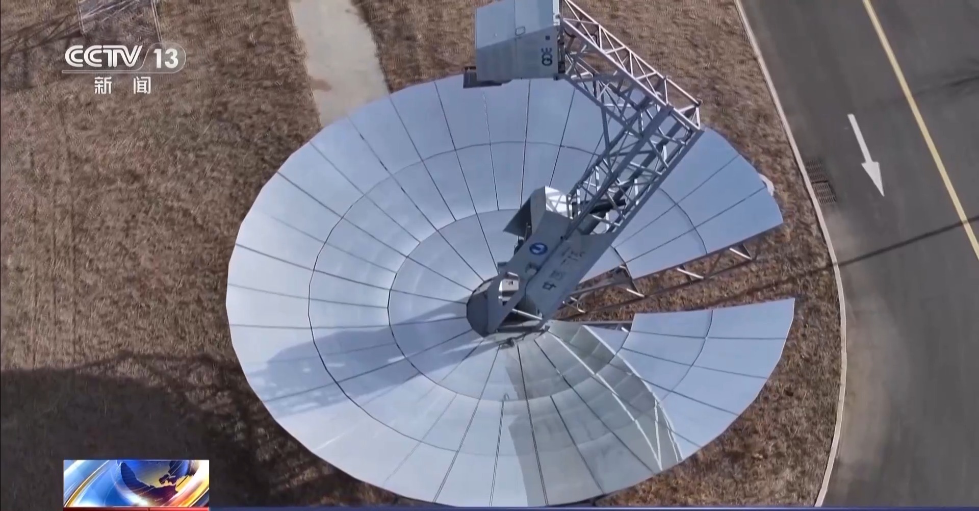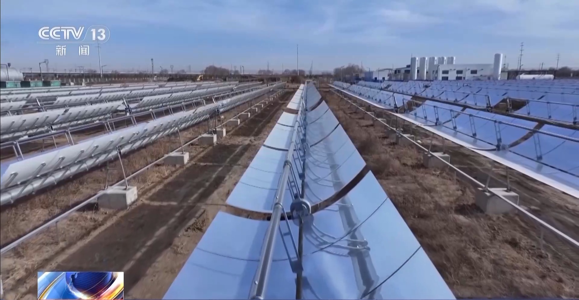 总台记者 修治国:储换热装置是压缩空气储能系统的关键环节。这里是槽式光热辅热模块,弯曲的金属板就像是一个长长的凹面镜,中间黑色的油路管,恰好位于凹面镜的焦点位置。太阳光经过反射,将热能反射到油路管上,管子中的油经过200多米持续加热,可以达到300℃,通过热油加热空气,让空气膨胀,带动发电机运转,实现空气动能与电能的转换。