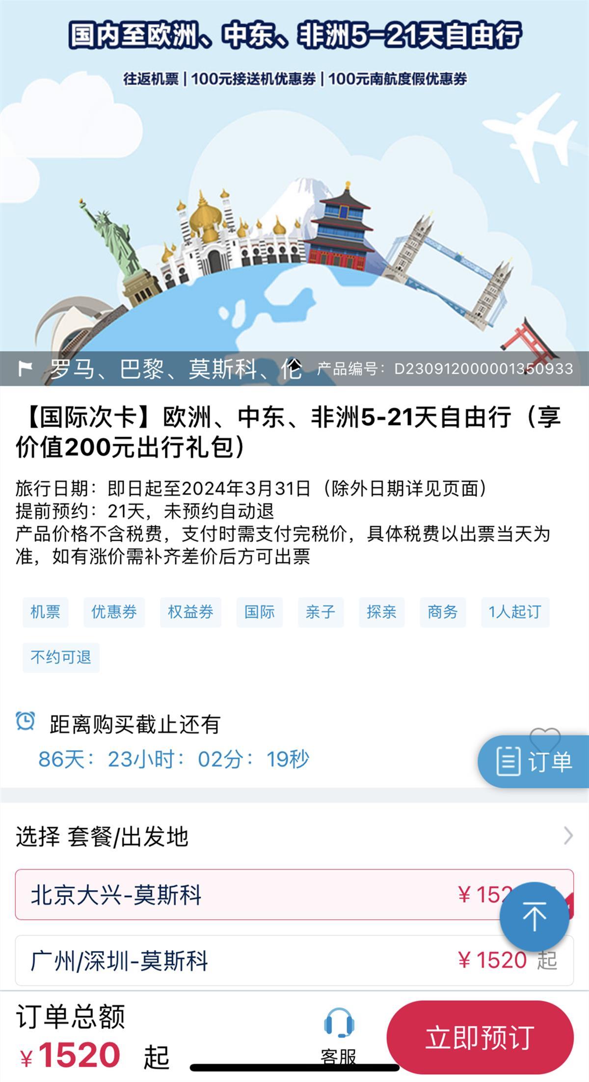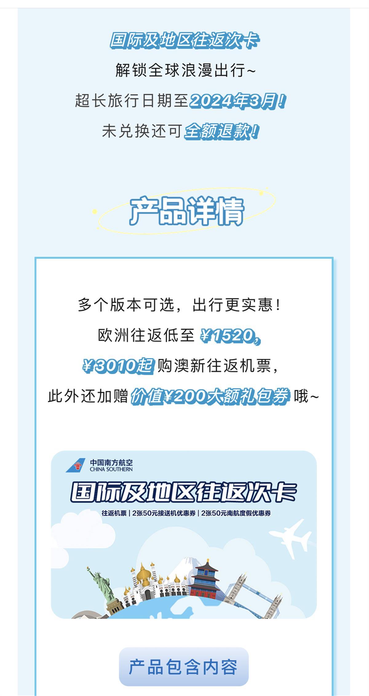 此外,欧洲往返次卡的价格为1520元起,目的地包括法兰克福、阿姆斯特丹、伦敦、巴黎、罗马等地。澳新等国际航线往返次卡3010元起,目的地包括悉尼、墨尔本、奥克兰。国际航班次卡出行日期截至2024年3月,未兑换可以全额退款。