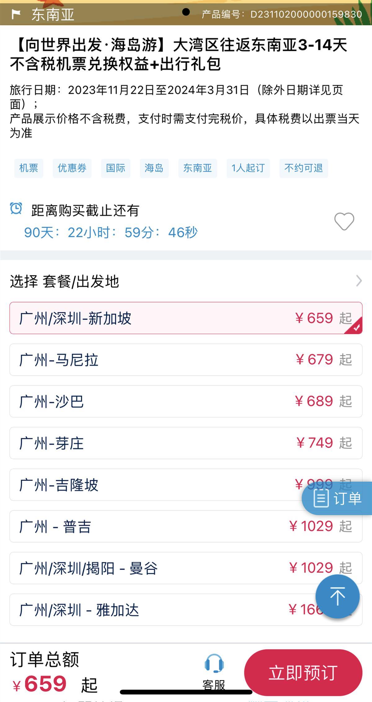南航推出的国际航班次卡产品中,东南亚地区往返机票次卡仅需659元起,出行日期限制在2024年3月31日前。其中,深圳飞新加坡659元,广州飞吉隆坡999元,广州飞曼谷1029元。