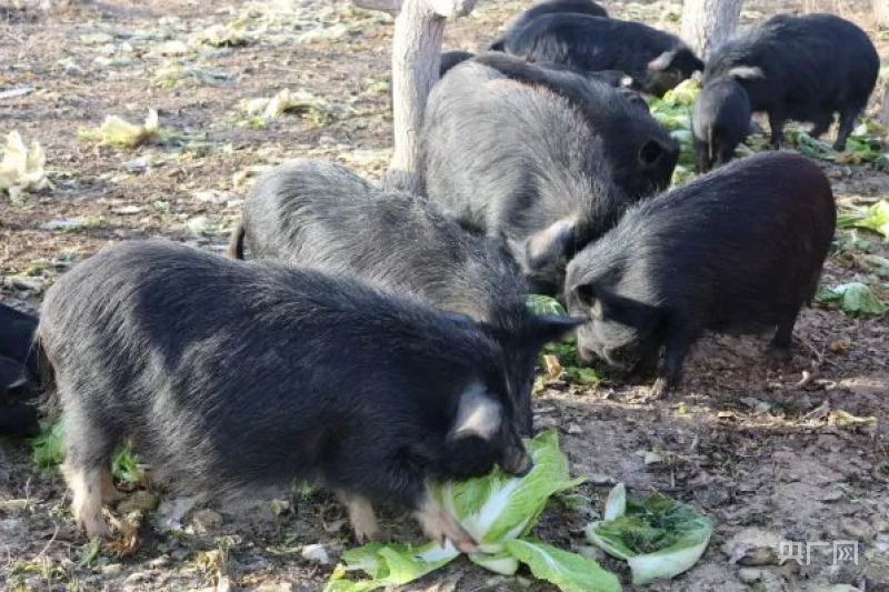 在英下乡金梨社区十五分场养殖户王波的梨园里,藏香猪正在觅食 (央广网发 刘茜琳 摄)