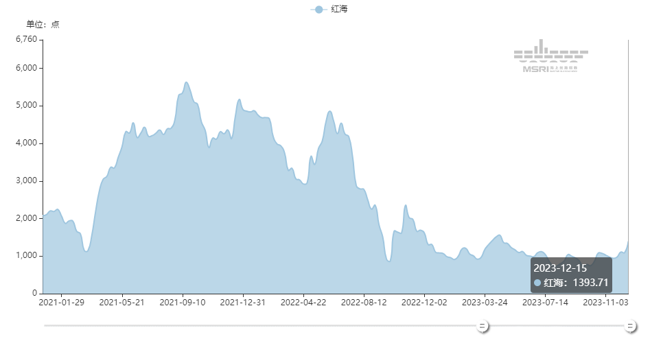 而亚欧航线运价“升温”的趋势,已然初见端倪。12月15日,红海航线的宁波出口集装箱运价指数为1393.71点,较上周上涨27.7%,受地缘政治因素影响,订舱价格大幅上涨。而“停航”和“绕道”的蔓延,或将使这一涨势延伸到欧洲、中东等其他区域。