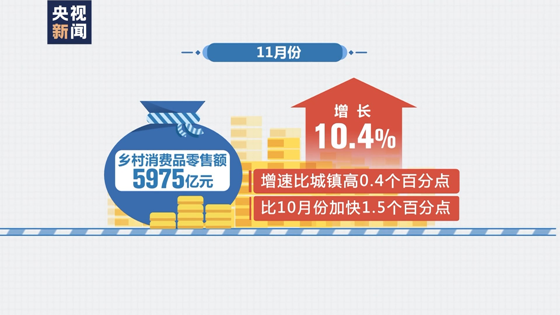 国家统计局最新数据显示,11月份,乡村消费品零售额5975亿元,增长10.4%,增速比城镇高0.4个百分点,比10月份加快1.5个百分点。