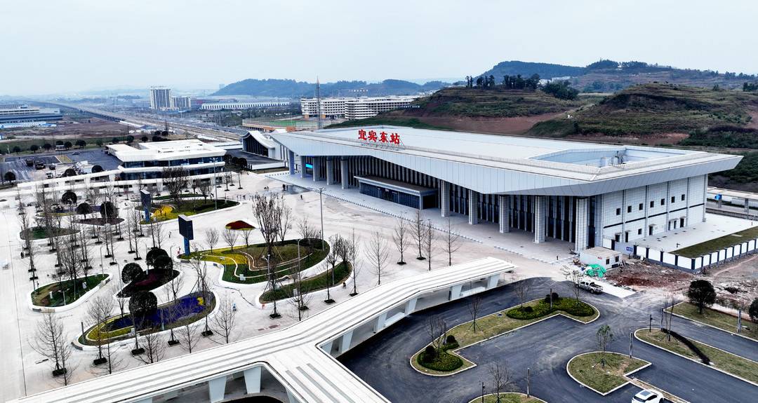 宜宾东站位于宜宾市三江新区境内,总建筑面积1万平方米,2台6线。据中铁九局成宜站房项目部副总工程师李连通介绍,站房外立面造型的起伏好似层叠的山峦,与三江新区周边的大片丘陵相呼应。立面上的三个门斗象征着从山中奔腾又在临港交汇的三江;细部处理充分融入科技感十足的视觉元素,寓意着三江新区如科技雄鹰般振翅欲飞。